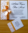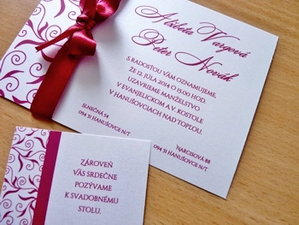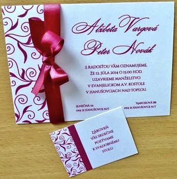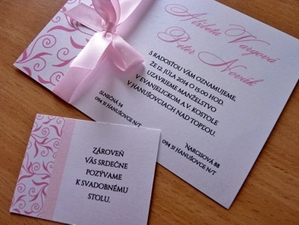 Pozvánka k svadobnému stolu má rozmer cca 7 cm x 5 cm, je vytlačená na rovnakom papieri ako svadobné oznámenie a je bez saténovej stuhy (prúžok na pozvánke je len vytlačený).