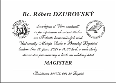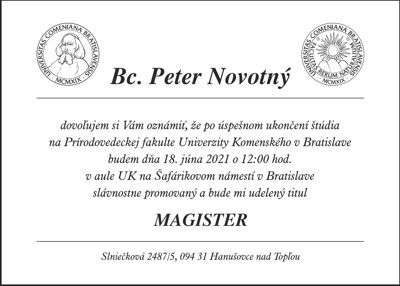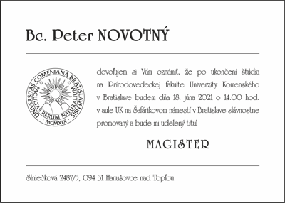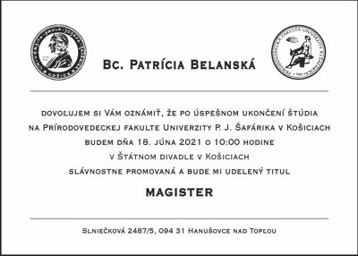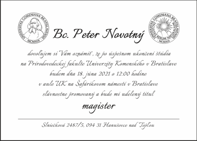Promočné oznámenia sú dodávané bez obálky. Rozmer oznámenia je je cca 14 cm x 10 cm. Na základe Vašej požiadavky je možné promočné oznámenie upraviť, napr. zmeniť typ alebo farbu písma. K dispozícii máme naozaj veľmi rozsiahly katalóg v ktorom sú logá vysokých škôl, ktoré proužívame iba pri tlači promočných oznámeni - viď. LOGÁ PRE PROMOČNÉ OZNÁMENIA. Na promočné oznámenie môžeme použiť aj Vami požadovaný obrázok resp. logo školy, ktoré môžete pripojiť k Vašej objednávke. Vybrať si môžete aj druh papiera, na ktorom bude Vaše promočné oznámenie vytlačené - viď. DRUHY PAPIERA. Cena promočných oznámení je uvedená v tabuľke nižšie a závisí od objednaného počtu kusov a od zvoleného typu papiera. Cenník poštovného je tiež uvedený v tabuľke nižšie.