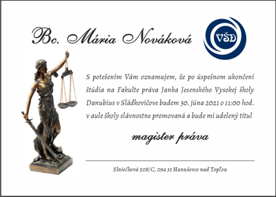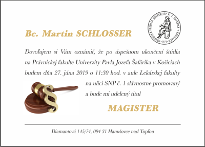 Promočné oznámenia sú dodávané bez obálky. Rozmer oznámenia je je cca 14 cm x 10 cm. Na základe Vašej požiadavky je možné promočné oznámenie upraviť, napr. zmeniť typ alebo farbu písma. K dispozícii máme naozaj veľmi rozsiahly katalóg v ktorom sú logá vysokých škôl, ktoré proužívame iba pri tlači promočných oznámeni - viď. LOGÁ PRE PROMOČNÉ OZNÁMENIA. Na promočné oznámenie môžeme použiť aj Vami požadovaný obrázok resp. logo školy, ktoré môžete pripojiť k Vašej objednávke. Vybrať si môžete aj druh papiera, na ktorom bude Vaše promočné oznámenie vytlačené - viď. DRUHY PAPIERA. Cena promočných oznámení je uvedená v tabuľke nižšie a závisí od objednaného počtu kusov a od zvoleného typu papiera. Cenník poštovného je tiež uvedený v tabuľke nižšie.
